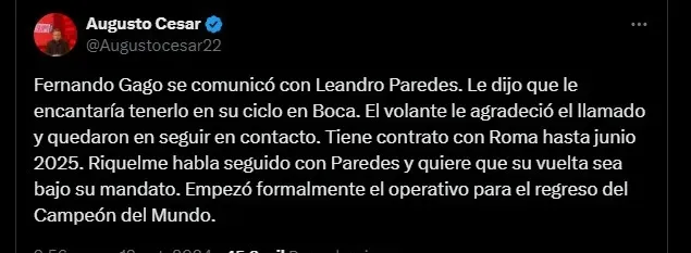 Por último, el periodista Augusto César agregó otro detalle. Y son las charlas que hace rato se dan entre Juan Román Riquelme y Paredes. El presidente quiere la vuelta del jugador bajo su mandato y regrese para la próxima temporada.