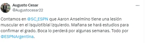 Aaron Anselmino estaría afuera de las canchas entre 21 días y 1 mes, dependiendo del grado del desgarro y la evolución del joven futbolista. El Xeneize comunicará el parte médico oficial desde sus redes sociales durante este miércoles.