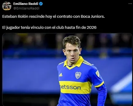 Según confirmó el periodista Emiliano Raddi de Planeta Boca Juniors, Esteban Rolón rescindirá su vínculo con la institución. El mismo vencía en diciembre de 2026 y, como no tiene lugar en el equipo de Russo, tomó la decisión de dejar el club en este último día de mercado para llegar a otro destino con el pase en su poder.