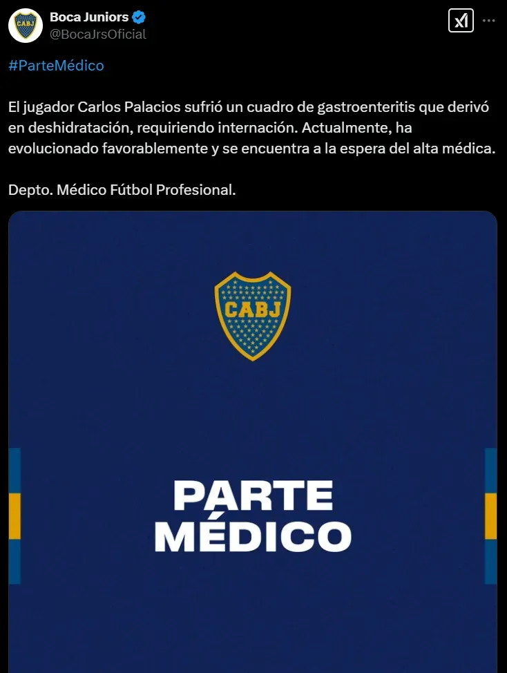 ¿Qué pasó con Palacios? El parte médico oficial del club de la Ribera informó que sufrió un cuadro de gastroenteritis que derivó en deshidratación y requirió una internación. De todas formas, el cuerpo médico de Boca aclaró que el jugador evolucionó “favorablemente” y está al a espera del alta médica.