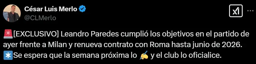 Ahora se conoció una nueva noticia sobre el futuro de Paredes, que cayó de manera inesperada en el Mundo Boca. Según informó el periodista César Luis Merlo, el mediocampista alcanzó los objetivos dispuestos en el vínculo que tiene con la Roma en la derrota ante el Milan y, de esta manera, renovará su contrato hasta junio de 2026.