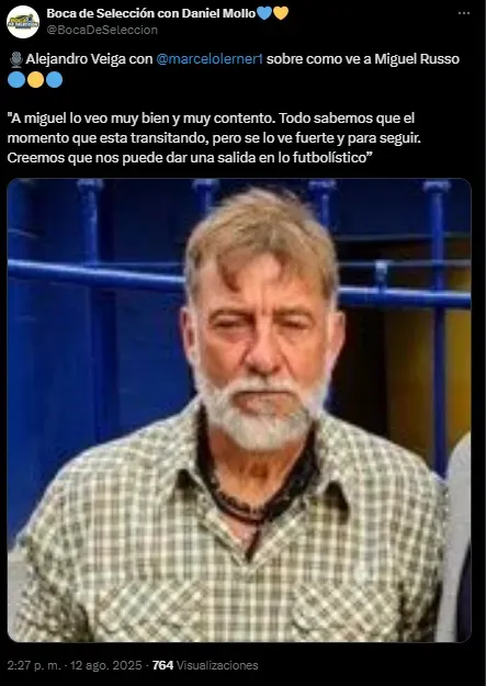 Russo pelea contra una enfermedad desde 2017 y ha tenido altibajos a lo largo de todos estos años. Sin embargo, Veiga confió en que el DT va a poder ayudar a Boca con su experiencia: “Yo pienso que Miguel debe analizarse cómo está él. Si se ve fuerte, sí está para seguir. Por supuesto que en Boca, así como lo fuimos a buscar, creemos que nos puede dar una salida en lo futbolístico”.