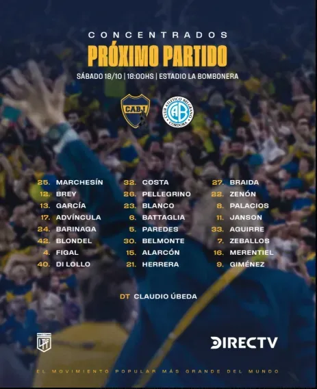 Claudio Úbeda definió a los concentrados de Boca para recibir a Belgrano en La Bombonera. Las dos bajas confirmadas son las de Edinson Cavani y Alan Velasco por lesión, mientras que Lucas Blondel reaparece como alternativa luego de casi 3 meses.