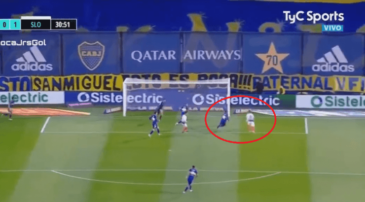 Al minuto 31, el paraguayo Ángel Romero jugaba por la izquierda tras una buena recuperación de Gordillo, la marca de Boca no pudo detenerlo y al final mandó un buen centro al segundo palo, donde apareció Gino Peruzzi para rematar. La jugada es muy clara ya que el volante de San Lorezno le gana la espalda al colombiano.