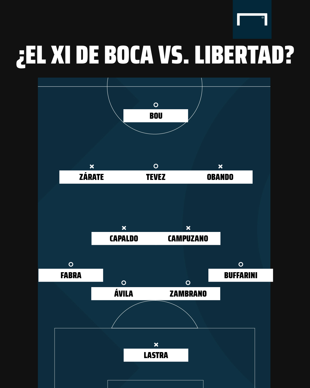 Entonces, un posible once podría ser con Lastra; Buffarini, Zambrano, Ávila, Fabra; Capaldo, Campuzano; Obando, Tevez, Zárate y Bou.