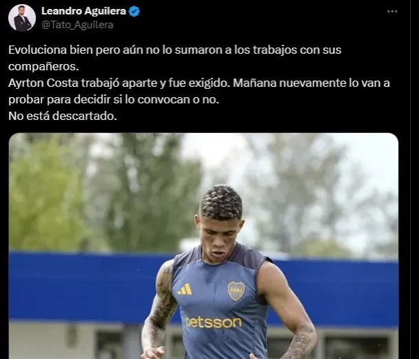 Después del partido ante Banfield como visitante, se dio a conocer que Ayrton Costa sufrió una molestia en el isquiotibial. Y por este motivo, el central se perdió el encuentro ante Alianza Lima y contra Aldosivi en La Bombonera.Y a dos días del determinante encuentro frente a los peruanos, se revelaron detalles sobre su situación física. Según reveló el periodista Leandro Aguilera, Ayrton Costa entrenó aparte en la práctica de este domingo a la mañana. Sin embargo, el jugador no está descartado.