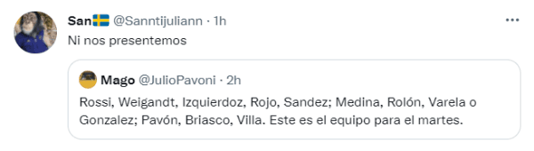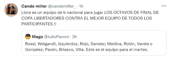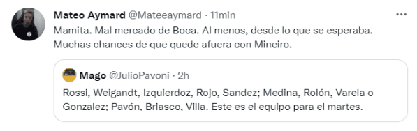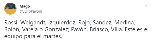 En las últimas prácticas, Russo fue repitiendo nombres y el periodista Julio Pavoni difundió el probable equipo que jugará la próxima semana ante el Mineiro. "Rossi, Weigandt, Izquierdoz, Rojo, Sandez; Medina, Rolón, Varela o Gonzalez; Pavón, Briasco, Villa. Este es el equipo para el martes", publicó el relator vía Twitter.