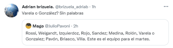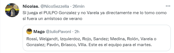 A simple vista está la única duda que tendría el DT de Boca para volver oficialmente a la competencia: Alan Varela o Diego González. Con más de 400 citas en la red social del pajarito, varios hinchas xeneizes mostraron su total disconformidad con la posible salida de Varela, quien tuvo un gran rendimiento en el último semestre de la mano de Russo.