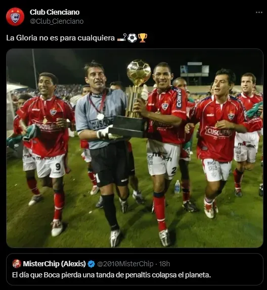 Tras un tuit del estadista español Mister Chip en la red social X (ex Twitter) en donde marca que “el día que Boca pierda una tanda de penaltis colapsa el planeta”, el Cienciano de Perú decidió repostear con una curiosa imagen de su equipo del 2004 con la Recopa Sudamericana.