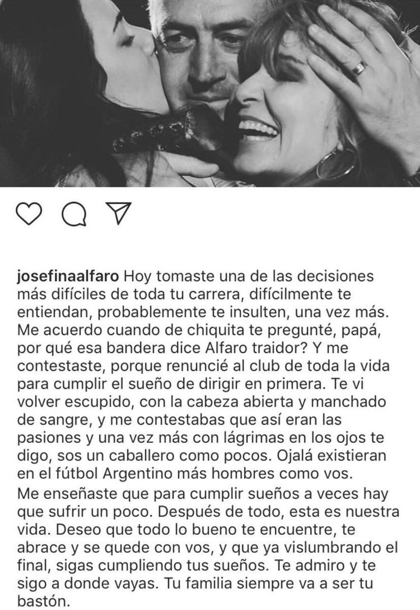 'Ojala existieran en el fútbol argentino más hombres como vos. Sos un caballero como pocos. Para cumplir los sueños a veces hay que sufrir un poco', fue uno de los tantos mensajes de la hija de Alfaro.