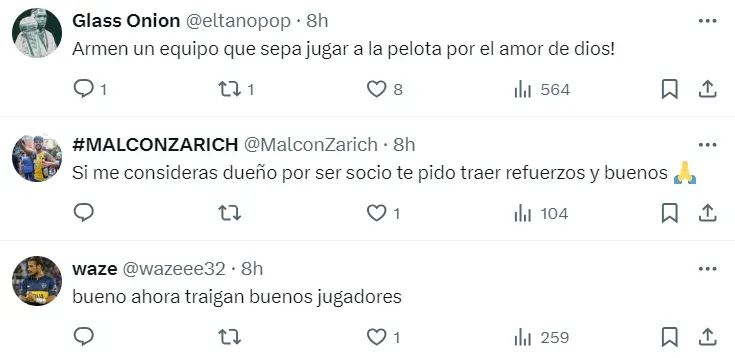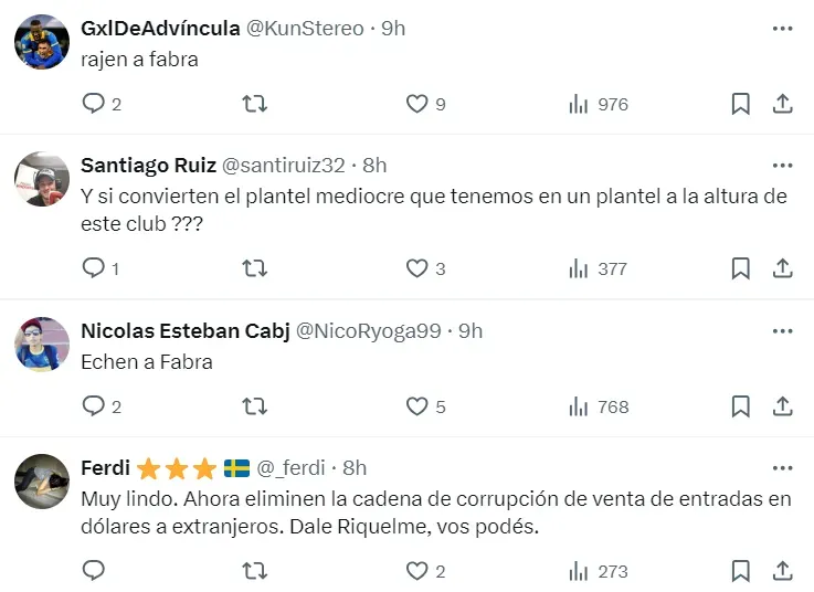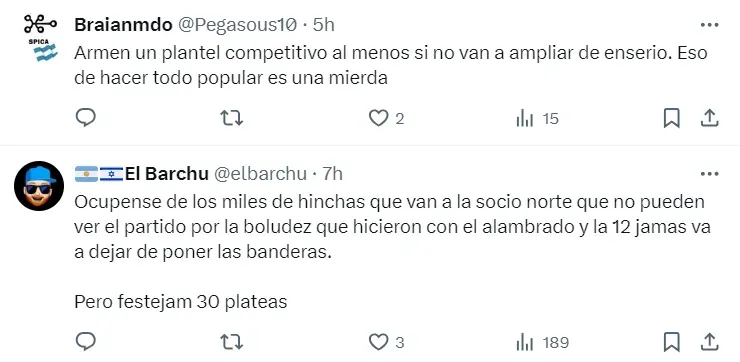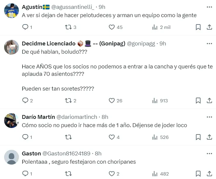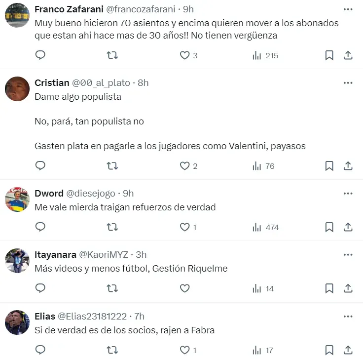 Boca compartió un video en sus redes sociales en el que mostraba algunas experiencias en las nuevas plateas y en los comentarios del mismo se llenó de quejas, reclamos e insultos. El principal apuntado fue Juan Román Riquelme, a quien calificaron como populista. Otros se quejaban por ser socios y no poder ir a la cancha, pero la gran mayoría tenía reclamos vinculados a lo futbolístico.