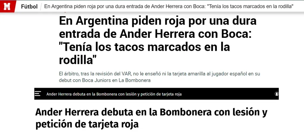 ”Ander Herrera se salva de la expulsión en su debut en la Bombonera”, tituló Mundo Deportivo, que en el interior del artículo le tiró con munición pesada al mediocampista vasco: ”El ex Athletic Bilbao no pesó en el juego, se vio desbordado en el mediocampo y terminó siendo protagonista por una dura infracción que merecía tarjeta roja y ni siquiera fue observada por el VAR”.