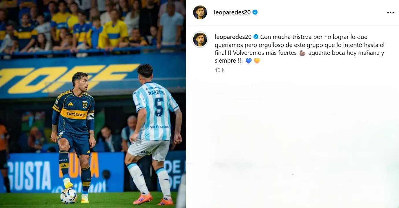 La derrota ante Racing fue un fuerte golpe para el plantel de Boca, que venía con un envión anímico muy importante. Poniéndole la cara a la eliminación, Leandro Paredes le dedicó un mensaje a los hinchas Xeneizes en las redes tras el partido en La Bombonera.
