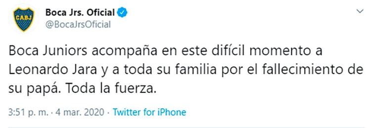 Una triste noticia fue confirmada por Boca a través de sus redes sociales en las últimas horas: falleció el padre de Leonardo Jara. “Boca Juniors acompaña en este difícil momento a Leonardo Jara y a toda su familia por el fallecimiento de su papá. Toda la fuerza”, fue el comunicado que emitió el club por la pérdida familiar del futbolista de 28 años.