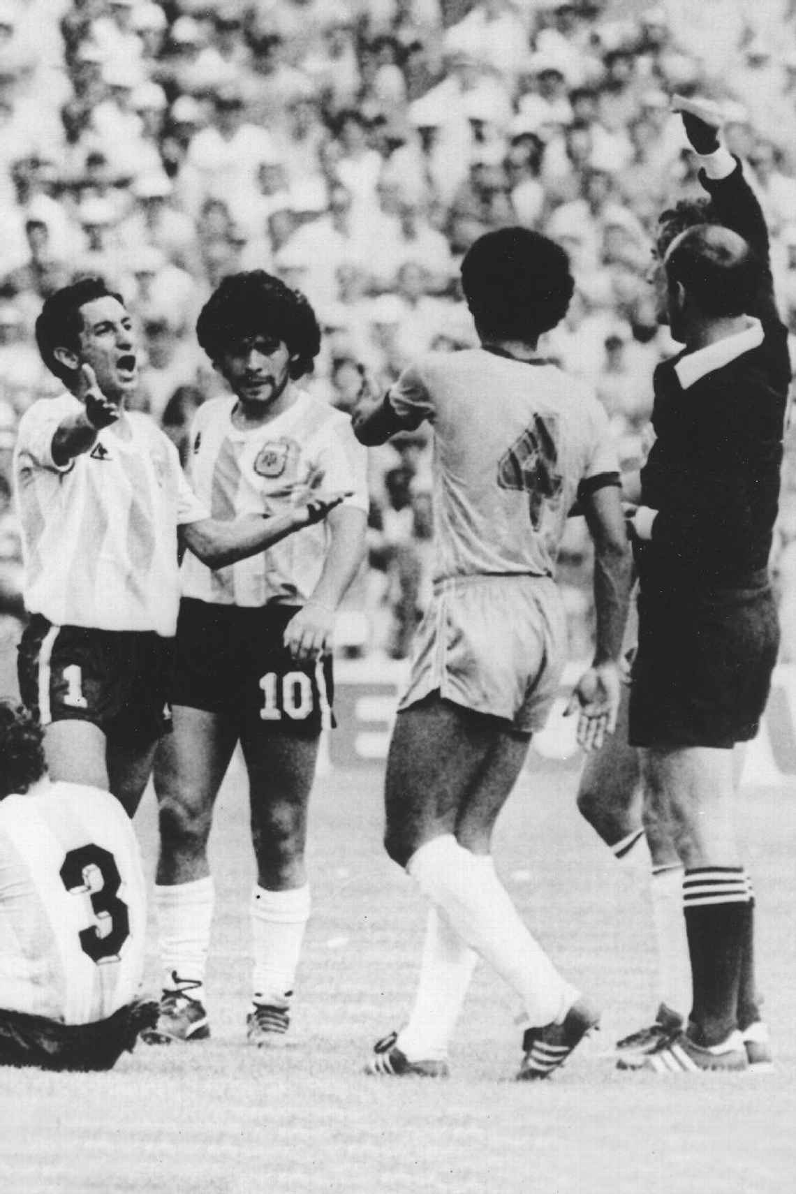 Después de la frustración por no poder participar del Mundial de 1978, llegó el turno de dar el presente en España 82. No fue el Mundial esperado: la Argentina no pudo repetir la actuación del 78, y quedó eliminada en la segunda ronda tras perder 3 a 1 con Brasil, partido en el que Diego, lleno de impotencia, pegó un planchazo que fue bien sancionado con la expulsión del argentino.