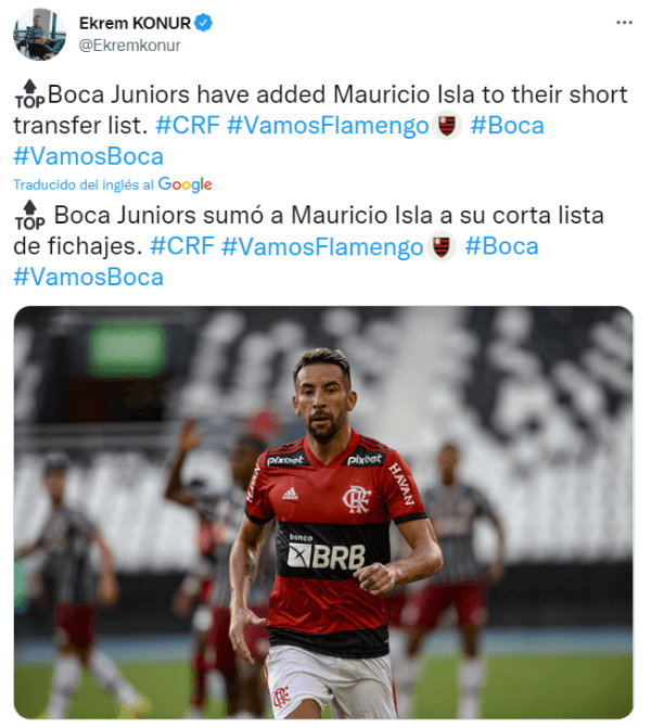 En línea con la información de cara al próximo mercado de pases, el periodista turco Ekrem Konur, experto en fichajes, confirmó el interés de Boca en un jugador extranjero que estuvo muy cerca de firmar en 2020. Se trata de Mauricio Isla, el defensor chileno que no seguirá en el Flamengo luego de que su DT le bajara el pulgar.