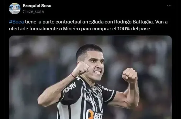 Según reveló el periodista Ezequiel Sosa en su cuenta de “X” (Twitter), Boca llegó a un acuerdo en su parte contractual con Rodrigo Battaglia. Todo esto, para ser jugador del Xeneize en este mercado de pases.A su vez, la fuente citada remarcó que Boca va a hacer una oferta a Atlético Mineiro por el volante para comprar el 100% del pase. Cabe recordar que el argentino de 33 años tiene vínculo en Brasil hasta finales de 2025 y, en caso de no salir en los próximos meses, el Atlético Mineiro lo perderá en condición de libre en diciembre.