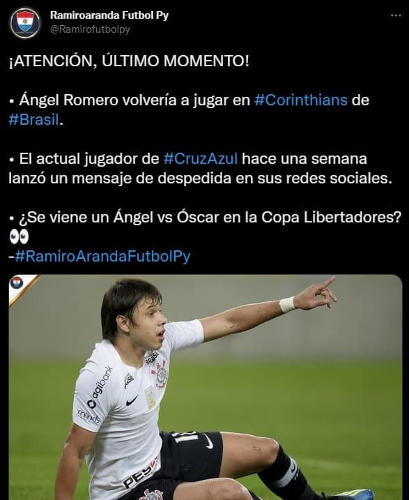 Se trata de Ángel Romero, quien hace poco publicó un mensaje que sonó a despedida en Cruz Azul de México. Si bien hace algunos días dijo que la prioridad la tiene "La Máquina Cementera", desde Paraguay y también en Brasil se habla del interés del Timao en sumar al volante como incorporación de lujo para los octavos de final frente al Xeneize.