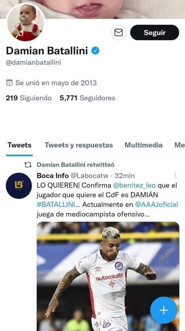 Luego de enterarse que la dirigencia de Boca, otra vez, lo tenía en carpeta, Batallini mostró sus ganas de ponerse la azul y oro con una mínima reacción en Twitter: le dio retweet (NdR: compartir una publicación) respecto a una información que citó la cuenta @Labocatw, donde el periodista Leo Benítez certificó el interés del Consejo de Fútbol.