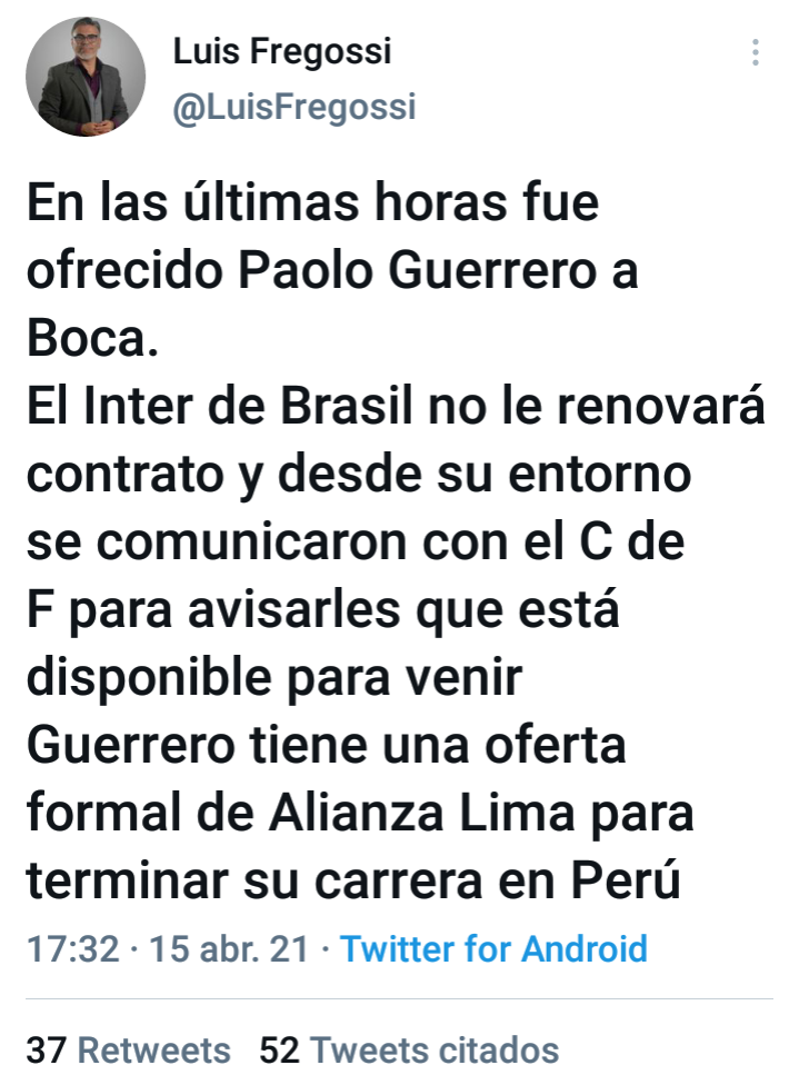 Al parecer Inter ya se comunicó con el Consejo de Fútbol en caso de que Boca esté interesado en el delantero, pero al mismo tiempo es importante agregar que el Alianza Lima de Perú también se puso en contacto con el futbolista de 37 años, para que justamente se retire compitiendo en la liga de su país. Aun así estos son solo rumores, por lo que aún queda por saber qué le parece al Xeneize la contratación de Guerrero.