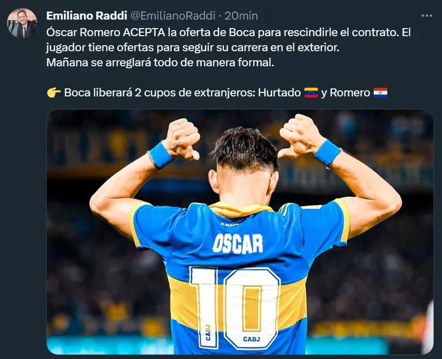 Fue el periodista Emiliano Raddi quien confirmó que el 10 paraguayo “acepta la oferta de Boca para rescindirle el contrato. El jugador tiene ofertas para seguir su carrera en el exterior. Mañana (jueves) se arreglará todo de manera formal”. Y ahora, el plantel azul y oro liberará otro cupo de extranjero, ya que en horas del mediodía se confirmó la salida de Jan Hurtado.