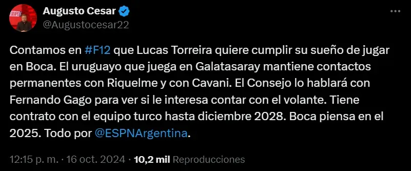 16/10/2024 Boca busca romper el mercado de pases y negocia por Lucas Torreira