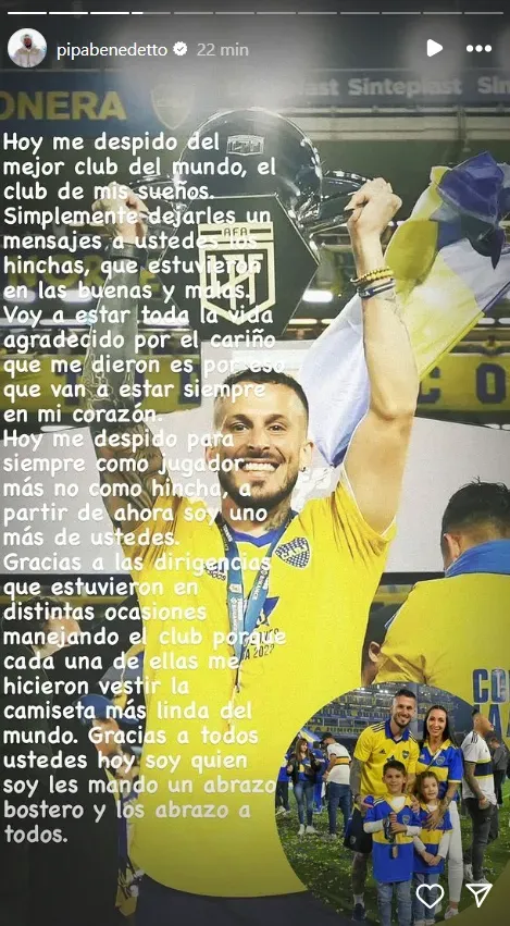 “Hoy me despido del mejor club del mundo, el club de mis sueños“, expresa el Pipa en el inicio de la carta a los simpatizantes y agregó: “Hoy me despido para siempre como jugador, mas no como hincha. A partir de ahora soy uno más de ustedes”.