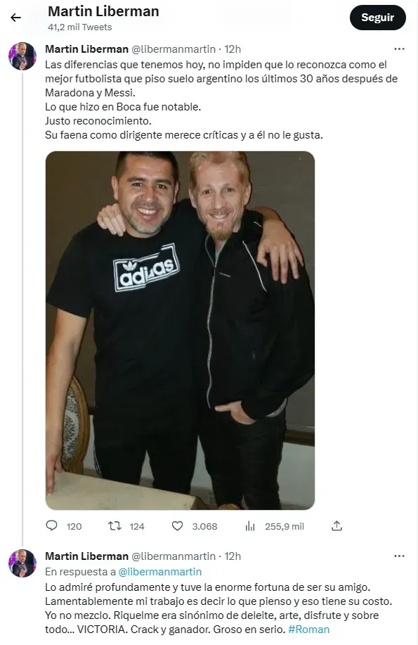 En el segundo tuit, Liberman se deshizo en elogios para con Román pese al distanciamiento que hoy los desune. “Lo admiré profundamente y tuve la enorme fortuna de ser su amigo. Lamentablemente mi trabajo es decir lo que pienso y eso tiene su costo. Yo no mezclo. Riquelme era sinónimo de deleite, arte, disfrute y sobre todo… victoria. Crack y ganador. Groso en serio“, cerró. Las palabras justas en una jornada vibrante que enalteció, una vez más, la intachable carrera de Juan Román Riquelme.
