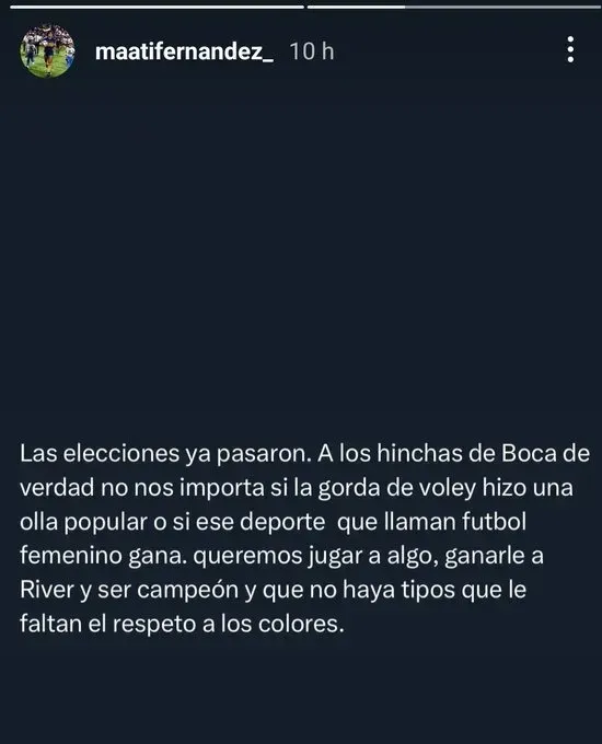 “Las elecciones ya pasaron. A los hinchas de Boca de verdad no nos importa si la gorda de voley hizo una olla popular o si ese deporte que llaman fútbol femenino gana”, subió en una historia de Instagram. Un texto que escribió otra persona y que él compartió en su cuenta personal.