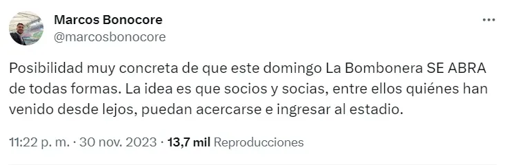 El periodista Marcos Bonocore informó que hay una “posibilidad muy concreta de que este domingo La Bombonera se abra de todas formas”. “La idea es que socios y socias, entre ellos quiénes han venido desde lejos, puedan acercarse e ingresar al estadio”, explicó.