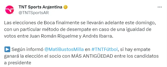 Según informó Matías Bustos Milla, periodista de TNT Sports, en caso de igualdad en las urnas, la elección la ganará el candidato presidencial con más antigüedad de socio: Andrés Ibarra.