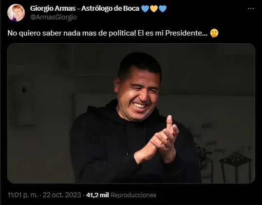 De manera sutil, y dejando de lado los nombres de Sergio Massa y Javier Milei, Armas posteó en sus redes sociales una imagen de Juan Román Riquelme a la que le sumó un contundente textual: “No quiero saber nada más de política! Él es mi Presidente…”, dejando en claro que Román finalmente se postulará como mandamás en las elecciones de Boca y las ganará por encima de Jorge Reale, Andrés Ibarra y otros candidatos que se postulen al puesto.