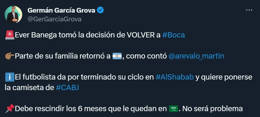 “Banega tomó la decisión de volver a Boca”, reportó el periodista Germán García Grova en sus redes sociales, y añadió que “parte de su familia retornó a Argentina”. Pese a la confirmación del retorno, aún no puede firmarse el vínculo con el ex Valencia CF, porque “debe rescindir los 6 meses que le quedan en Arabia Saudita”, algo que no sería inconveniente.