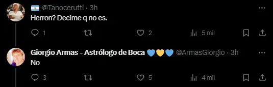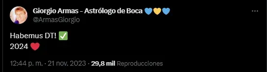 En este contexto, quien soltó un contundente título acerca del futuro del cargo de DT en Boca fue Giorgio Armas, el astrólogo que trabaja para la institución boquense. Mediante sus redes sociales, el experto en astros y rituales manifestó que el Xeneize ya tenía entrenador confirmado, pero no reveló el nombre del mismo. “Habemus DT”, soltó Armas junto con un “2024” y un emoji de un corazón. Pese a no revelar la identidad, dejó en claro una sola cuestión: no será Mariano Herrón el que continuará en el cargo, ya que luego de este interinato regresará a la Reserva.