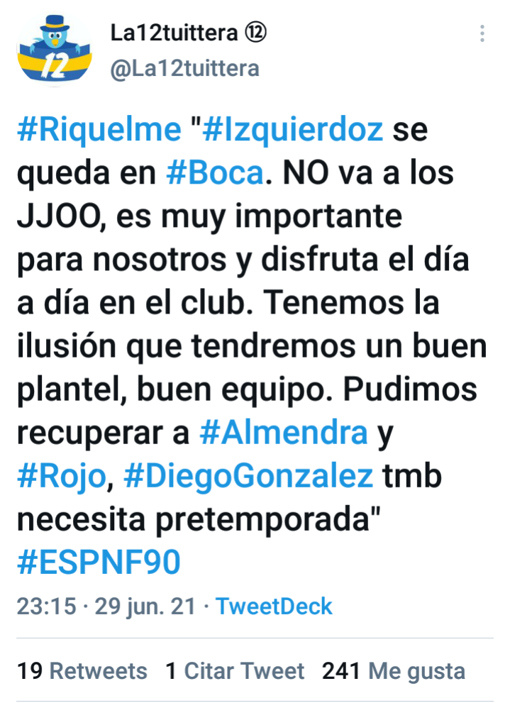 La siguiente fue la decisión que tomó Juan Román Riquelme. “Izquierdoz se queda en Boca, no va a los Juegos Olímpicos. Es muy importante para nosotros y disfruta el día a día en el club. Tenemos la ilusión de armar un buen plantel, un buen equipo”. Inmediatamente decenas de hinchas se alegraron por la noticia, ya que muchos consideran que Carlos Izquierdoz es el mejor central del plantel de Russo.