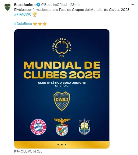 Donde sí habló el Xeneize fue a través de sus medios oficiales, más precisamente en el perfil del club en la plataforma X (antes Twitter), comunicando los tres rivales a los que enfrentará Boca en la fase de grupos de la nueva competición que verá la luz entre junio y julio de 2025.