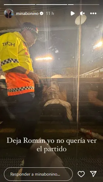 A través de un posteo en sus redes sociales con una foto de cómo tenía su perspectiva del partido en La Bombonera, Mina Bonino acompañó la imagen con un texto en donde dejaba un reclamo para Riquelme: “Dejá Román, yo no quería ver el partido”, escribió Bonino en su historia de Instagram.