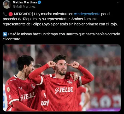 Según reveló el periodista Matías Martínez de Radio La Red, el presidente del Xeneize y si representante llamaron a Felipe Loyola sin hablar con Independiente antes. Menciona que hay “mucha calentura” por el accionar del Román y que pasó lo mismo hace un tiempo con Sergio Barreto, quien hoy está en el fútbol mexicano.