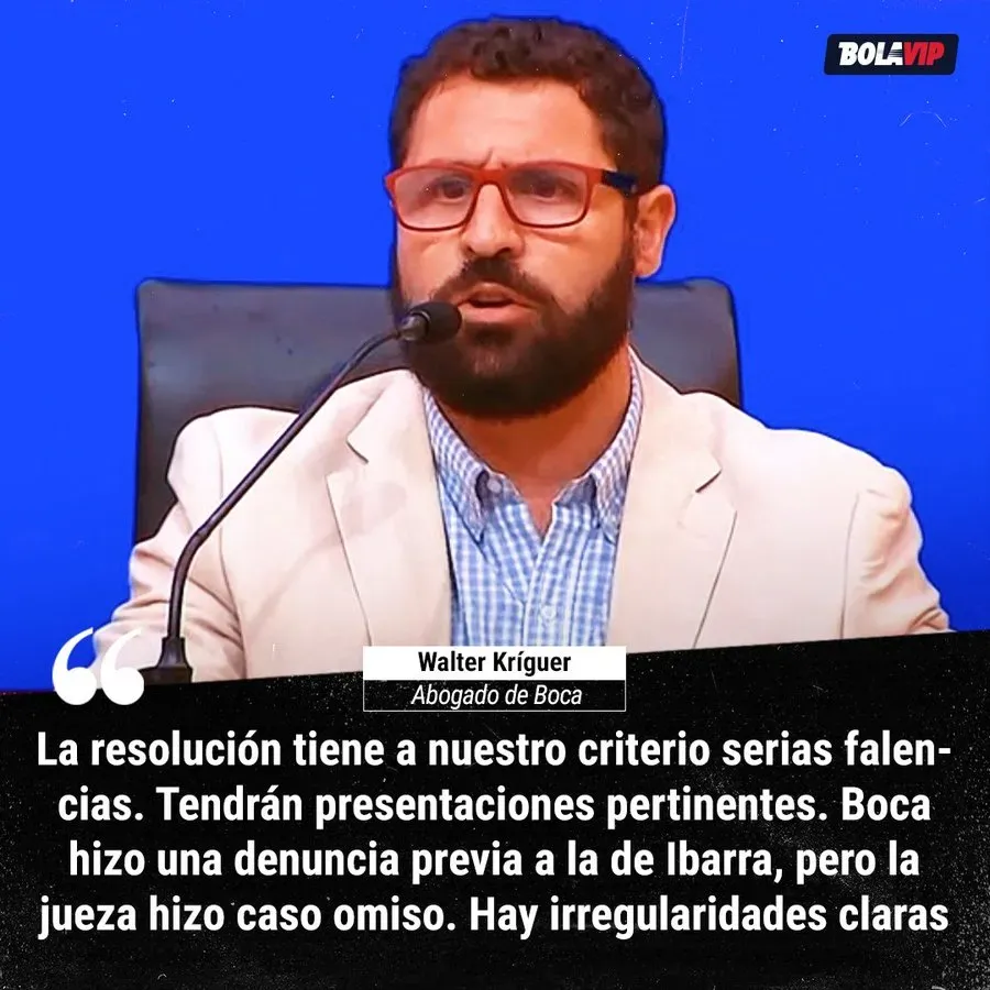 Por medio del abogado que tiene el Xeneize, Walter Kríguer, se expidieron sobre la resolución de la jueza Alejandra Abrevaya que suspendió los comicios durante la jornada matutina del martes 28 de noviembre. El letrado sostuvo que “la resolución tiene a nuestro criterio serias falencias. Tendrán presentaciones pertinentes. Boca hizo una denuncia previa a la de Ibarra, pero la jueza hizo caso omiso. Hay irregularidades claras”.