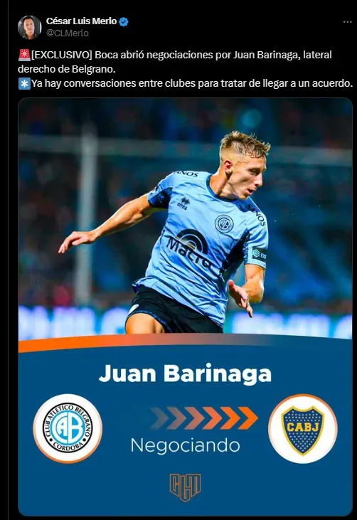 Fue el periodista Césa Luis Merlo quien reveló “Boca abrió negociaciones por Juan Barinaga, lateral derecho de Belgrano”. Y siguió: “Ya hay conversaicones entre clubes para tratar de llegar a un acuerdo”.